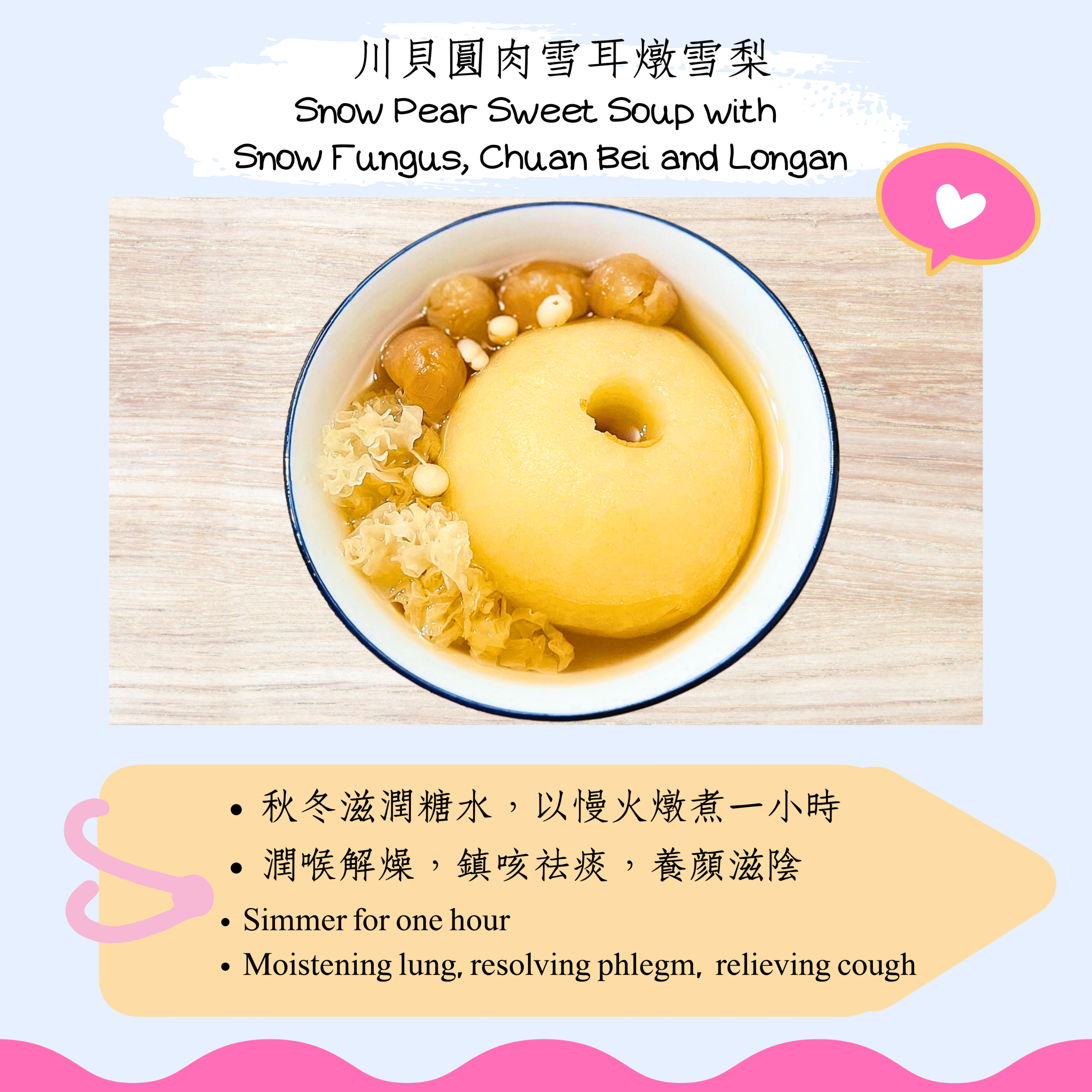 A traditional Chinese dessert made with snow pear, snow fungus, and dried longan. Lightly sweet, refreshing, and believed to nourish the lungs and hydrate the body. Best enjoyed warm or chilled.